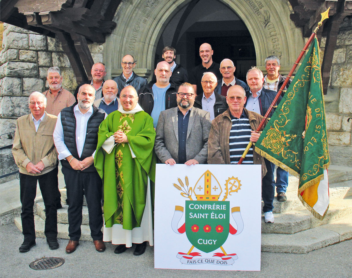 Patron des orfèvres et plus largement de tous les métiers liés au travail du fer – par exemple les maréchaux-ferrants – Saint Eloi est une confrérie attachée à sa devise qui figure évidemment en bonne place sur le nouveau drapeau béni le 15 octobre lors de la messe dominicale. Forte actuellement d’une quinzaine de membres, elle s’est donné un nouveau gouverneur en la personne d’Alexandre Bersier qui a succédé à Daniel Bersier ainsi qu’un nouvel aumônier, l’abbé Nicolas Glasson remplaçant le Père Jean Richoz, ancien prêtre résidant à Cugy. C’est lui qui a béni le nouveau drapeau en présence des membres de la confrérie. « Nous voulons être fidèles à notre dimension chrétienne en étant actifs au service des personnes âgées de notre communauté locale» explique le nouveau gouverneur.