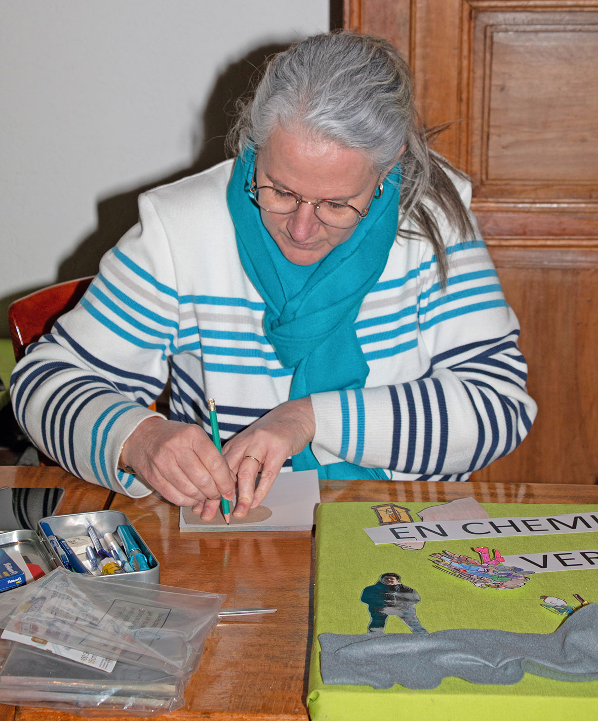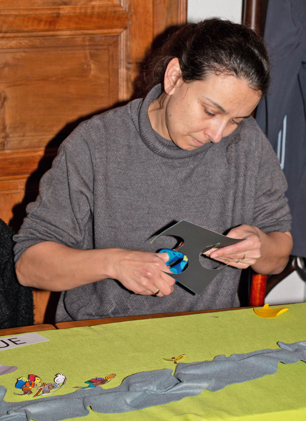 Rafaelle Marcaro en train de préparer des documents qui seront utilisés durant les rencontres avec les enfants et les parents.