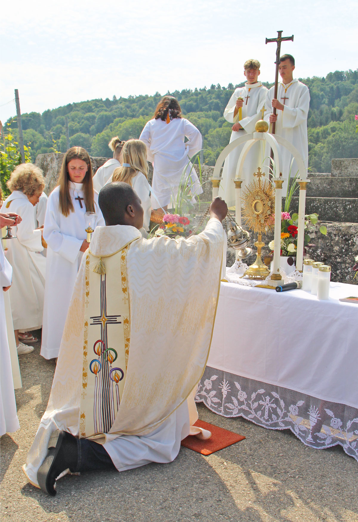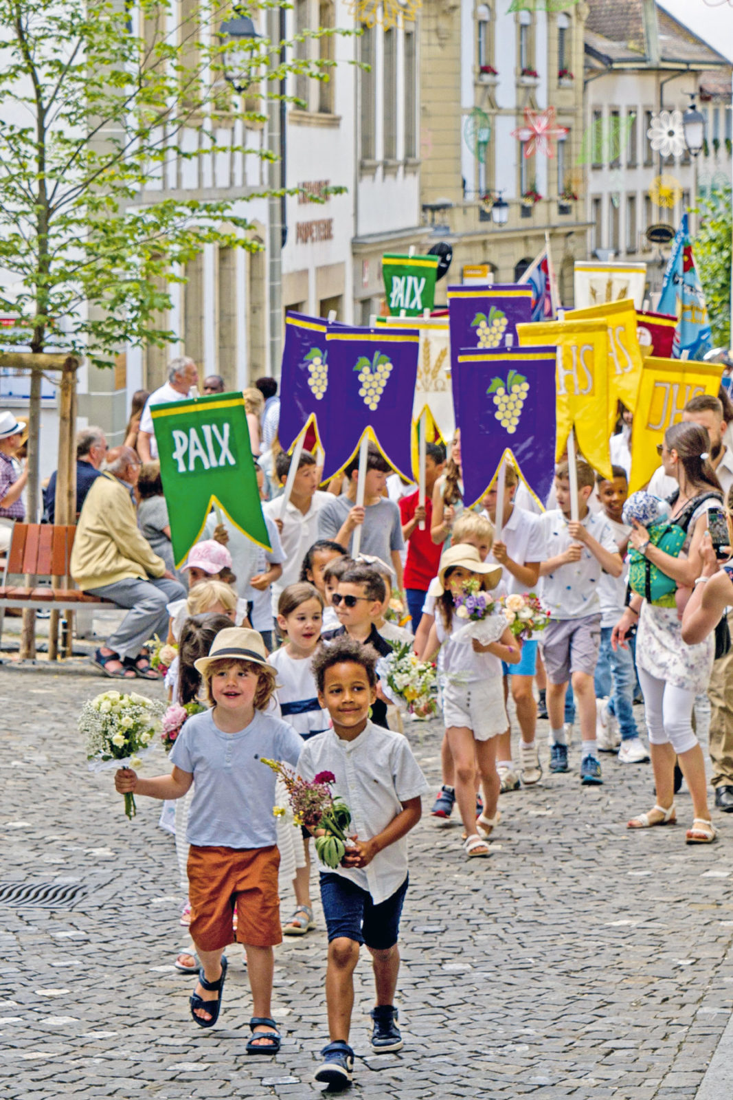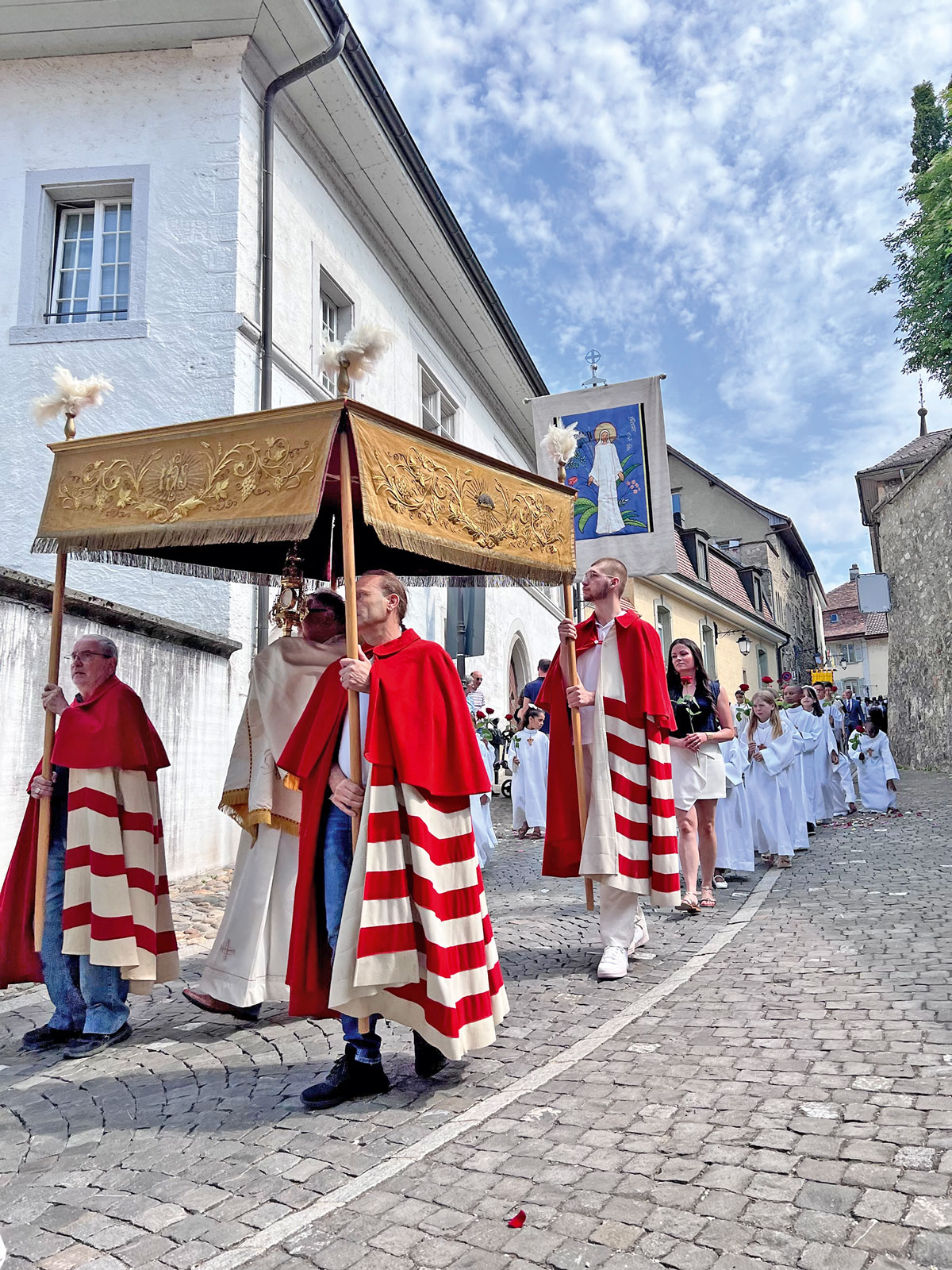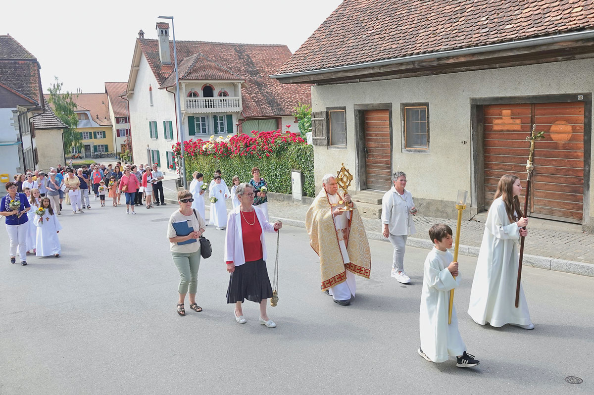 … la procession a emprunté un nouvel itinéraire raccourci après la messe à la collégiale. C’était la première Fête-Dieu vécue à Estavayer pour le nouveau curé-modérateur, l’abbé Darius.