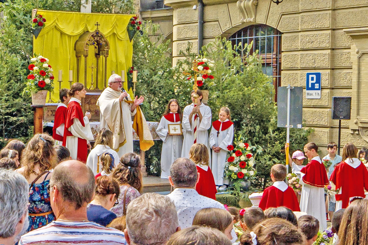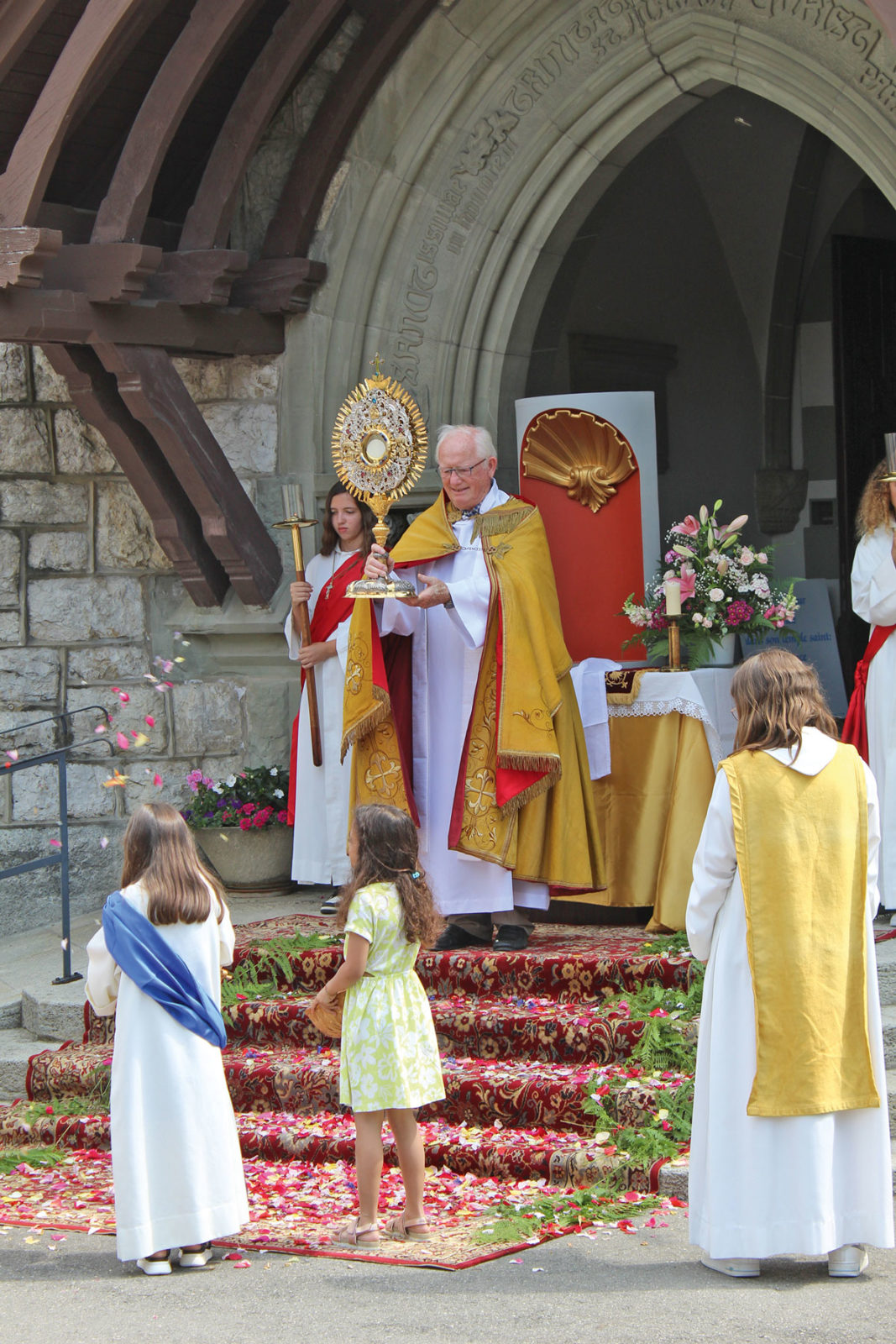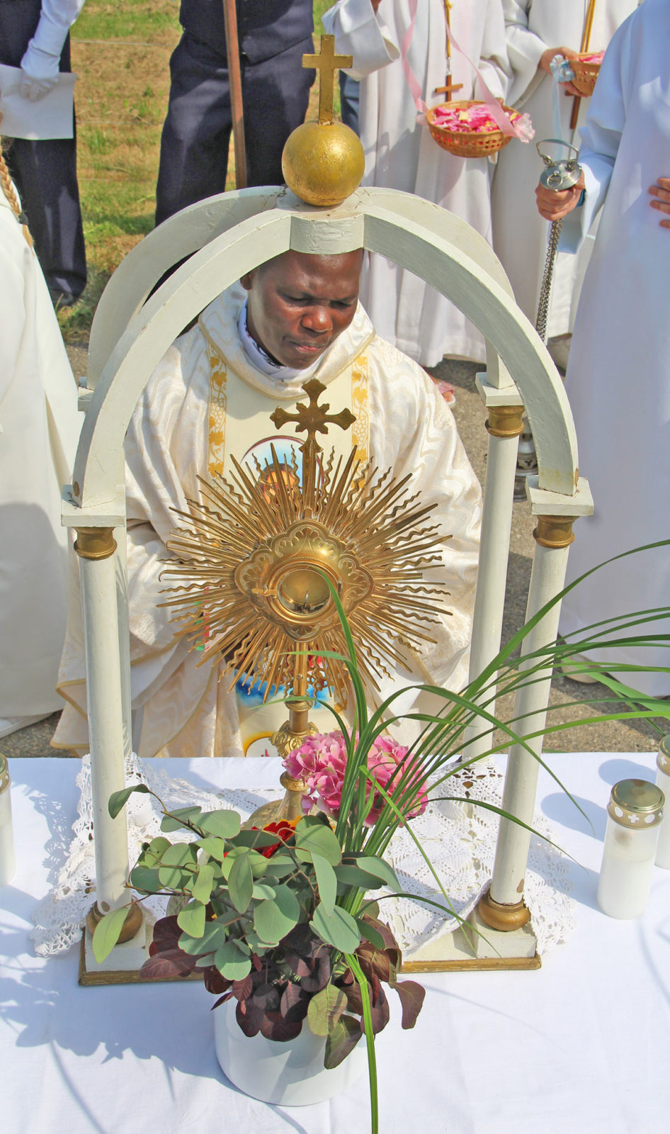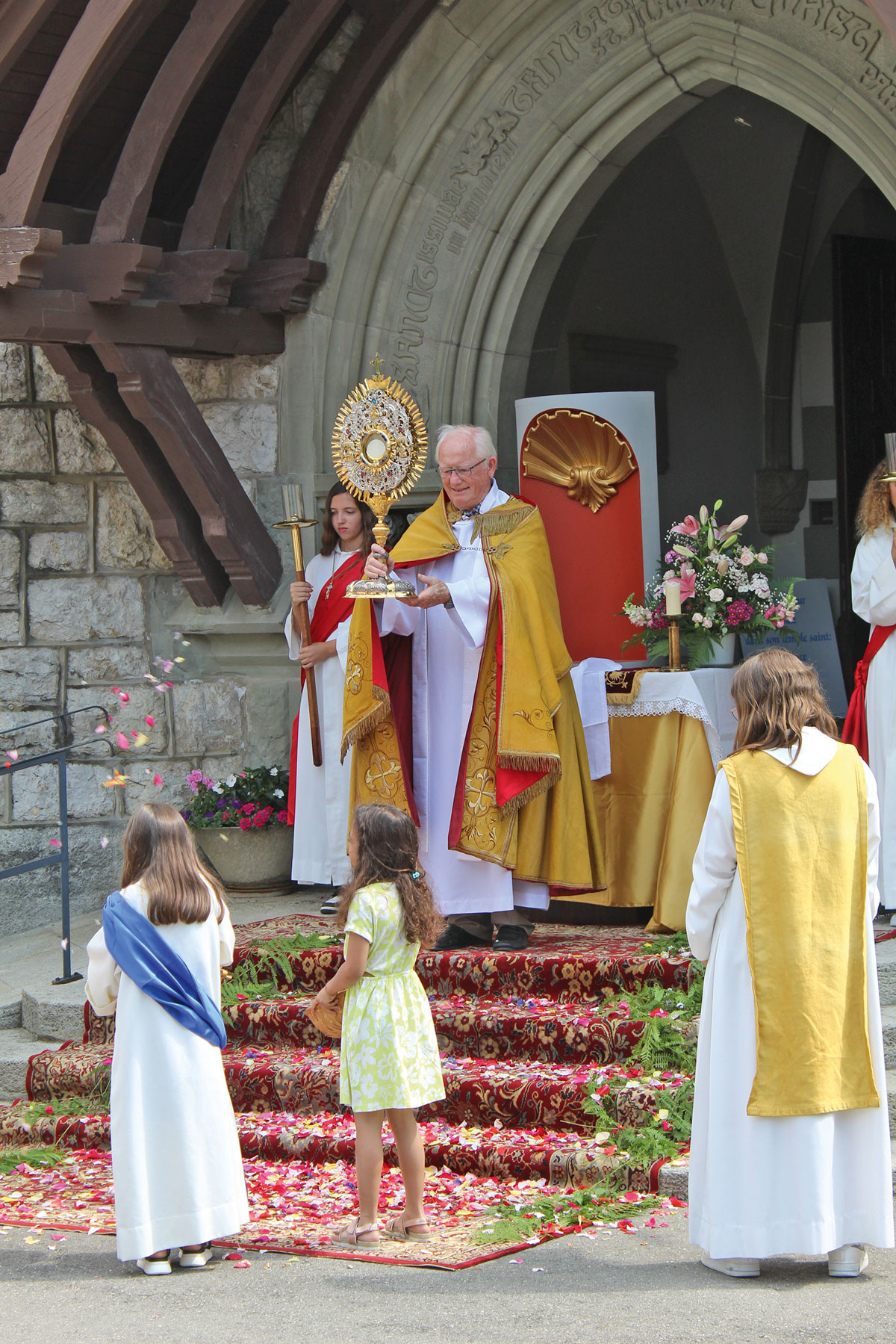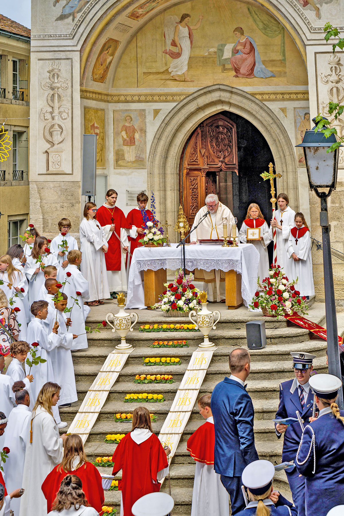 … la procession a emprunté un nouvel itinéraire raccourci après la messe à la collégiale. C’était la première Fête-Dieu vécue à Estavayer pour le nouveau curé-modérateur, l’abbé Darius.