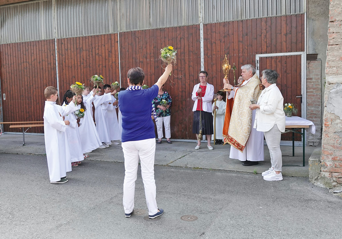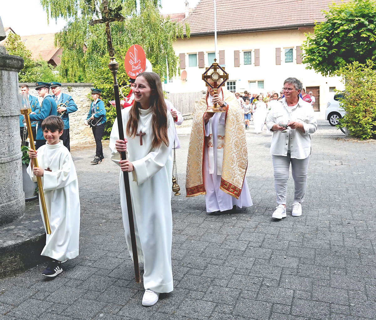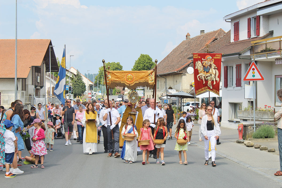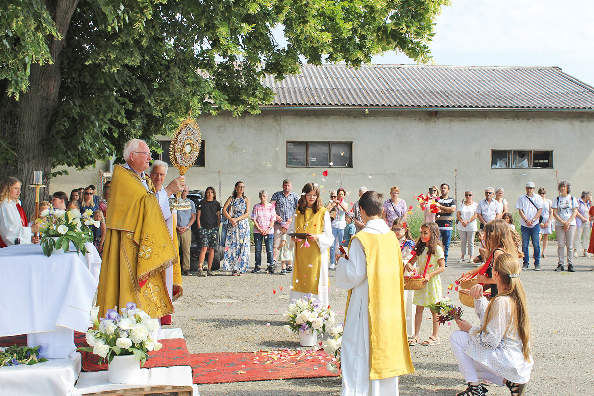 C’est l’abbé Jean-Louis Hôte, de la communauté des Focolari de Montet, qui a célébré la messe et conduit la procession à travers le village de Cugy avec la participation du chœur mixte et de la fanfare.