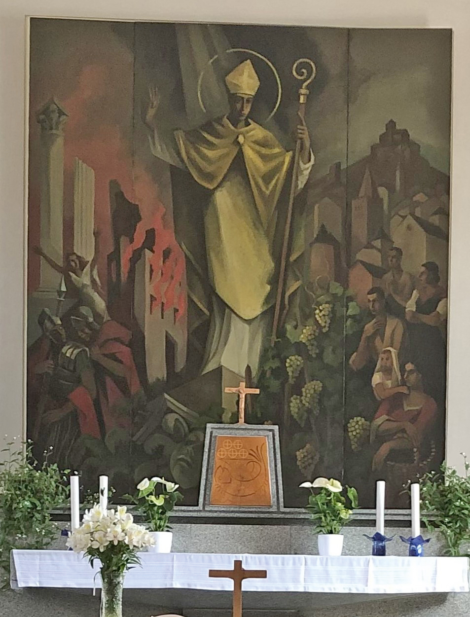 Le chœur de l’église a été restauré en 1954, sous la direction de MM. Rosset et Matthey. L’autel a été refait avec une table en grès que surmonte un grand retable de M. Paul Monnier. Au centre, l’artiste a représenté saint Théodule à Sion dans la cité épiscopale de ses successeurs, dominée par l’église de Valère. Saint Théodule, la crosse à la main gauche, montre une maison en flammes, tandis qu’une femme éplorée et des soldats romains sont terrassés au milieu des vestiges du paganisme vaincu. De l’autre côté, Monnier a groupé des chrétiens qui implorent leur Evêque et qui ainsi s’oppose à la stupeur des païens de l’autre volet.