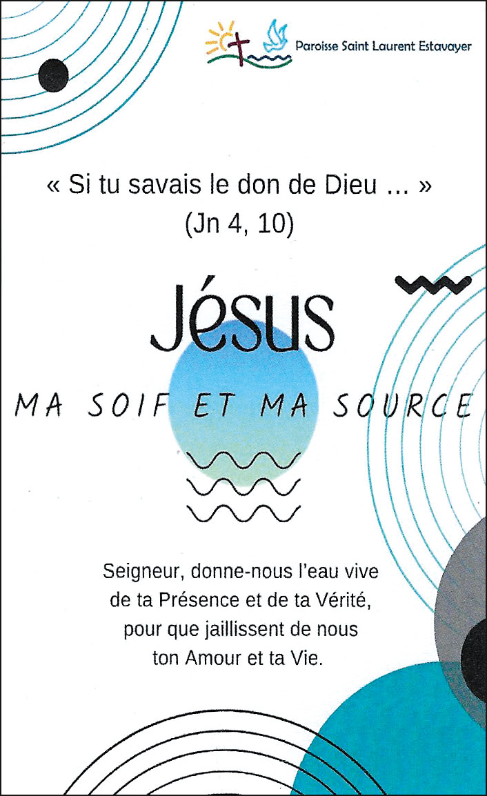 Déjà largement diffusé via notre site internet ainsi que par le biais d’un signet offert aux paroissiens et à disposition toute l’année dans les différentes églises de notre paroisse, cette composition vous est présentée ici en format partition. Inspiré de la rencontre entre Jésus et la Samaritaine (Jn 4, 5-26) le texte exprime sous forme de prière, cette invitation à accueillir le don de Dieu, en laissant grandir en nous notre soif intérieure qui nous pousse à le chercher, Lui, la source d’eau vive. Que le peuple de Dieu que nous sommes s’abreuve à cette source qui est le Christ afin que jaillissent de nous des torrents de vie et d’amour donnés et reçus gratuitement.