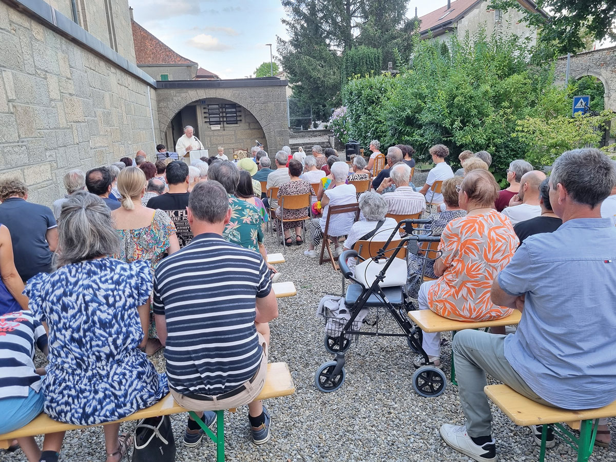 A Murist, c’est sur le parvis de l’église que plus de 60 fidèles de tous âges sont venus prier et célébrer la solennité de l’Assomption. Dans la moiteur d’une belle soirée estivale, l’abbé Nazaire a présidé cette célébration animée par le chœur de Murist et leurs amis du chœur de Châbles-Font-Cheyres. Et comme de coutume, tout le monde s’est retrouvé à l’issue de la messe autour d’un verre de l’amitié pour un moment fraternel bien apprécié.