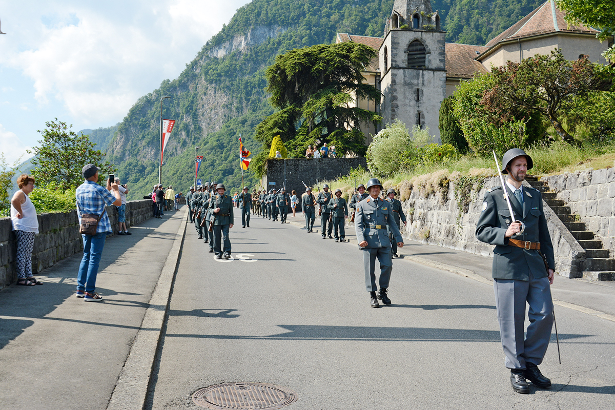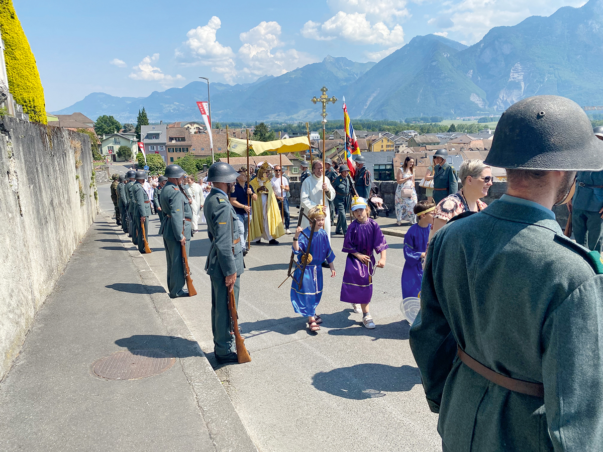 A Vouvry, la Fête-Dieu mobilise de 8h45 à 21h30 une trentaine de militaires avec trois générations d’uniformes. A la messe du matin chacun reçoit une bénédiction du célébrant. Le repas de midi est en famille. De retour pour les vêpres, la milice vit ensuite son assemblée annuelle suivie d’une assiette dans un établissement du village avant de revenir pour la prière du soir. Ils concluent la partie officielle avec le discours du commandant suivi traditionnellement de trois chants a capella dont « Marignan » avec la fanfare.