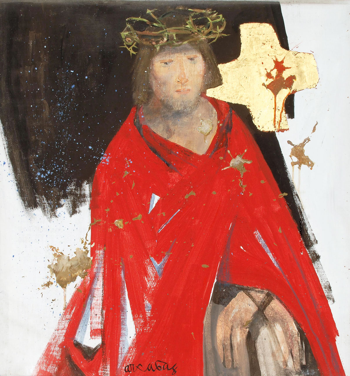 Le Christ Roi. Peinture d’Arcabas. « Les soldats prirent aussi la tunique ; c’était une tunique sans couture, tissée tout d’une pièce de haut en bas. » Jn 19, 23