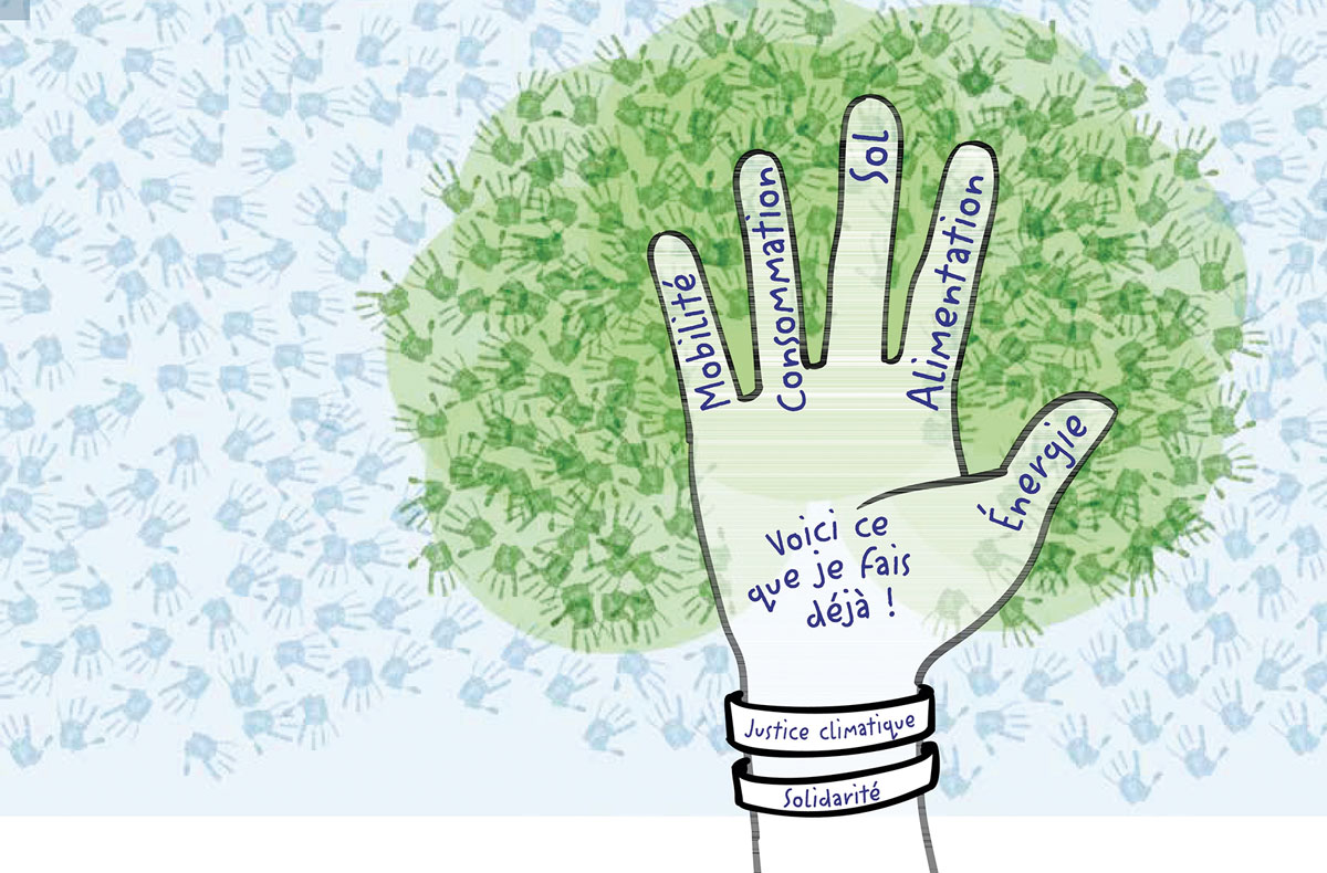 Nos actions individuelles visant à préserver le climat sont certes importantes. Cependant, il faut reconnaître qu’elles se révèlent insuffisantes à long terme pour minimiser notre impact environnemental. Notre mode de vie en Europe engendre en effet une consommation des ressources qui dépasse largement les limites de ce que notre planète peut générer. Par opposition à l’empreinte carbone, qui mesure l’impact des émissions de gaz à effet de serre d’une activité sur l’environnement, le concept d’« empreinte de la main » permet de se focaliser sur le potentiel d’économie des ressources. L’accent est mis sur les effets positifs de ce qui est réalisable et sur la mise en œuvre d’actions concrètes. Ce changement de perspective permet de passer du je au nous et de transformer un sentiment individuel de frustration ou de découragement en un mouvement de réussite collective.