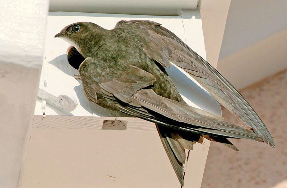 Un martinet noir agrippé à son nichoir.