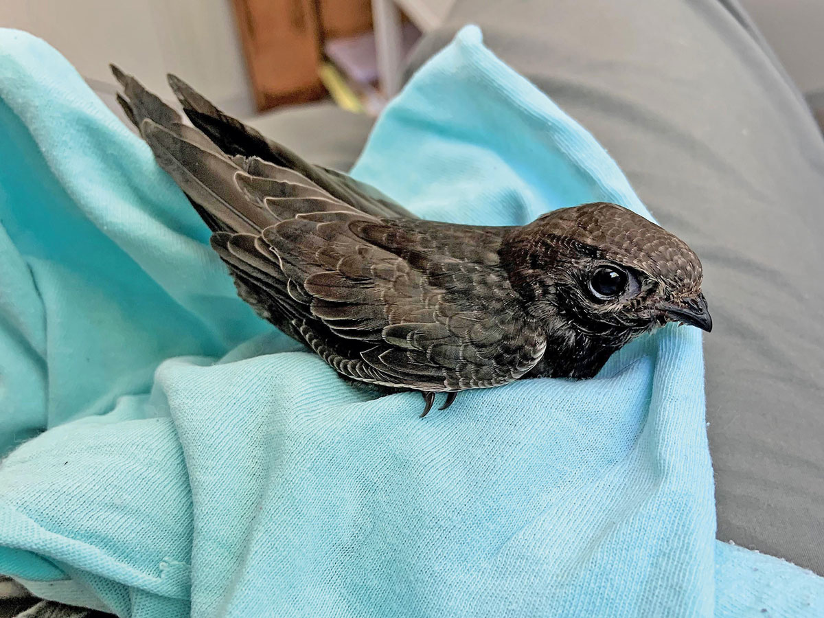 Un jeune martinet noir manipulé avec délicatesse.