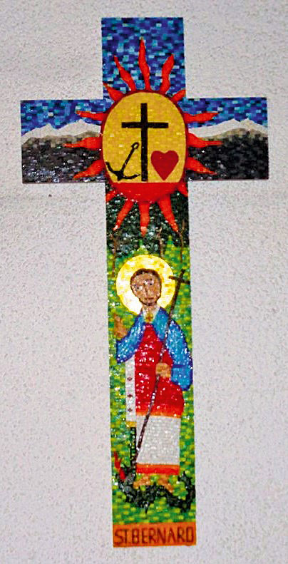 Mosaïque visible à l’église de Martigny-Croix avec les insignes de l’Hospice du Simplon, le cœur, l’ancre et la croix.