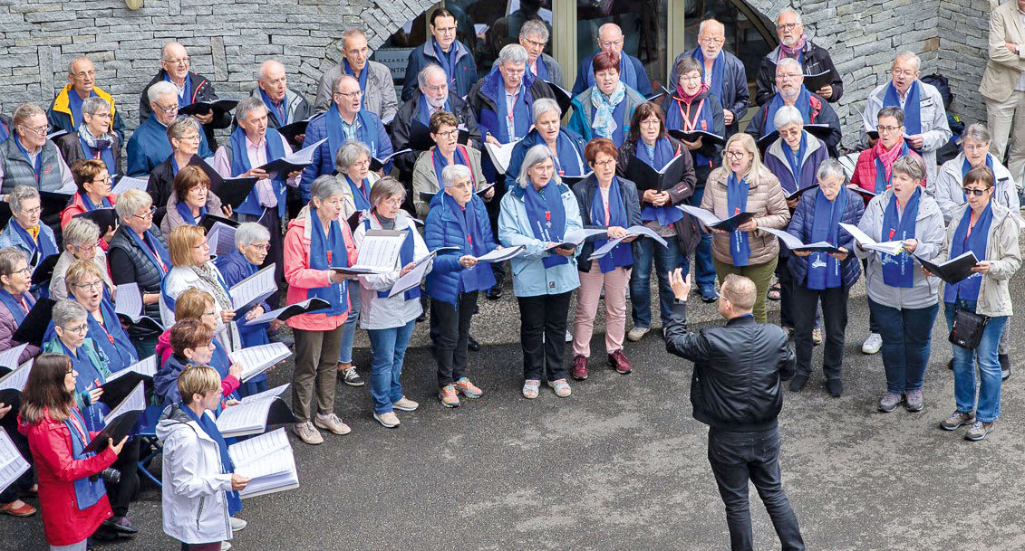 Cette chorale particulière rassemble des chanteurs de toute la Suisse romande. Ils représentent une belle cohorte aux habitudes bien diverses que leur directeur, Emmanuel Pittet, essaie d’amener à l’unité et à la beauté par la fusion des voix et des énergies de chacun pour animer les célébrations de la semaine du pèlerinage.