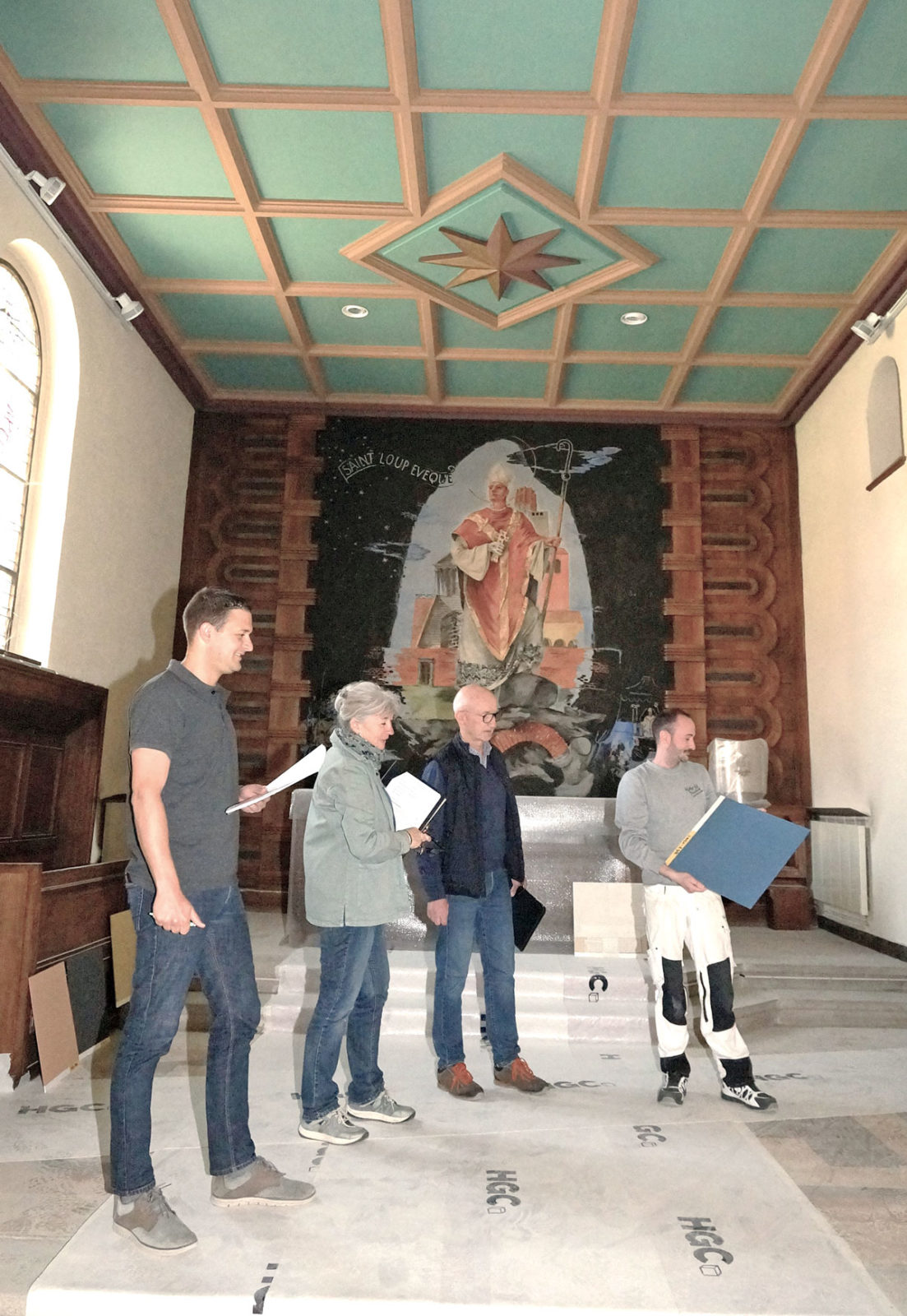 Les travaux actuels permettent de recouvrir les bas-côtés d’un crépi spécial et de changer la câblerie électrique. Mais la partie la plus délicate de cette rénovation consistera à refaire toute la peinture intérieure, en respectant strictement les couleurs d’origine. Par exemple, un bleu spécial dans le transept et le chœur. Un beige spécial viendra également habiller la nef. La porte en bois du fond de la nef sera reconstituée dans les règles par un restaurateur d’art.